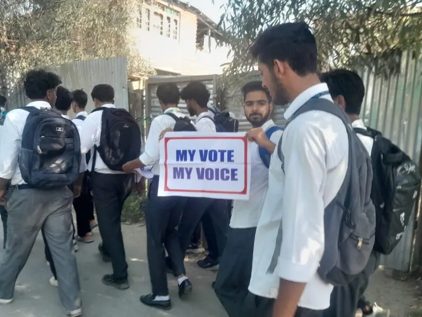 ◆克什米爾年輕人舉着標語鼓勵大家投票。