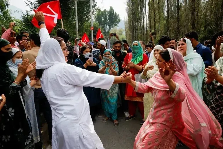 ◆2024年10月8日,議會選舉結果公佈當天,查謨和克什米爾全國大會黨的支持者在斯利那加的計票中心外慶祝。