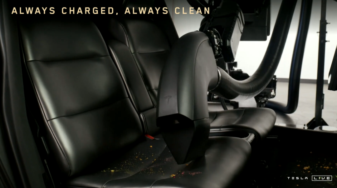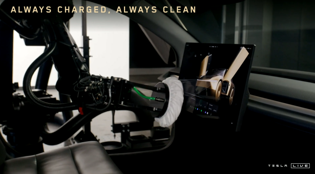 比較有意思的是,馬斯克為了讓他們的無人出租車更高效的運轉,還設計了一套不需要人的維護系統。可以給車子做自動的吸塵、屏幕清潔,甚至在車上都沒有充電口了,只要和手機一樣通過無線充電就行。