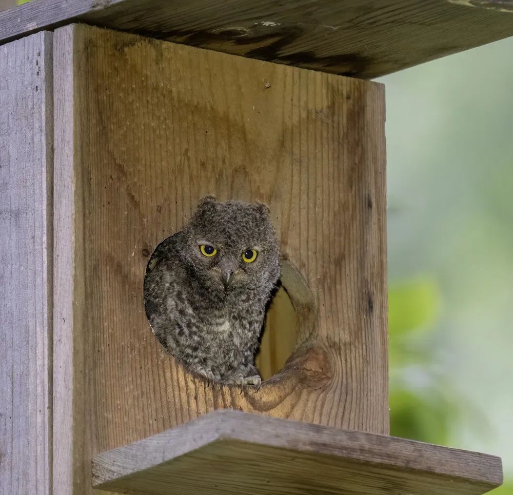 紅角鴞叼着鰓金龜餵給巢箱裏的雛鳥 ©大貓