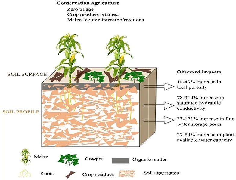 保護性耕作的示意圖,玉米和豇豆套種,並用秸稈鋪在地上保護,增加土壤的多孔性和持水性 圖片來源:Ogwu94 / wikimedia