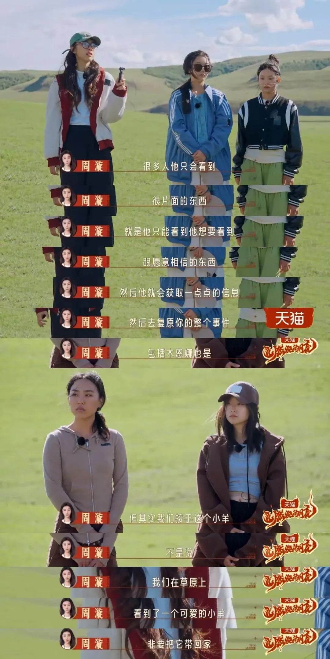 可見,女性成長不是一蹴而就的,而是各自保持着節奏。“粗活聖體”張歆夢,漸漸地有了穿繩打結的水磨功夫。“暗黑廚神”吳玉曉,也得到了姐妹們的認可。謝菲直面網絡暴力,表態可以罵我但不要罵我的羊。大姐荊唱,找到了團體更多的向心力。開心果王美涵,總能在逆境中找到積極因素逗笑大家。周漩坦言以前面對未知以前恐懼多一些,現在嘗試和勇敢更多。王思晗則認為“老天爺終究會眷顧你的,可能不讓你擁有一些東西,也可能會有一個更大的禮物送給你”。