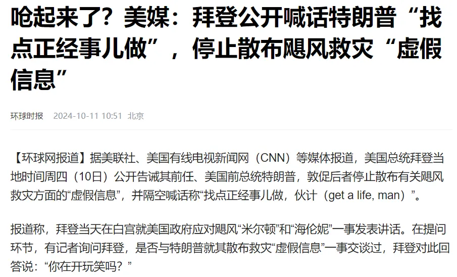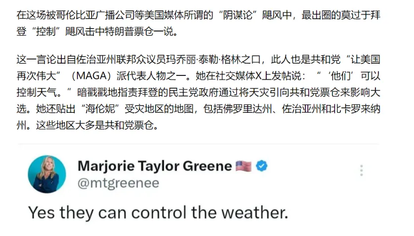 不過對於美國兩方來説,事實恐怕也沒有那麼重要了,就比如説海倫妮有利於哈里斯還是特朗普,美國網絡甚至都沒有形成共識,支持哈里斯的人擔心,救災不力會導致搖擺州倒向特朗普,而特朗普粉絲則認為,救援遲緩是因為鄉村地區受災更重,鄉村的選民更支持特朗普,這是民主黨的毒計,甚至有人直接陰謀論到了氣象武器的階段,邪惡的深層政府為了對抗正義的特朗普支持者,不得不使用氣象武器,這想象力實在是讓人頗為無語。