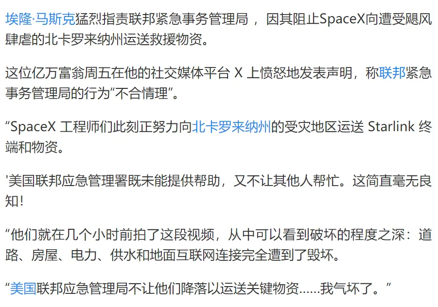 首先開團的自然是我們熟悉的,頭像已經帶上了“MAGA”帽子的馬斯克先生,他先是表示往災區送了很多套星鏈,來幫助災民恢復通信,然後指責以FEMA(美國聯邦應急管理署)為代表的應急管理部門有錢去幫助非法移民,沒錢救助美國本土的災民,指責他們封鎖了災區進出,導致想去救援的私人力量也進不去,指責救災款和物資壓根沒有轉到災區人民手上,指責對不同選區的救災進行雙重標準。而偏共和黨的宣傳也快速跟進,無論是推特還是tiktok,瘋狂攻擊救災的不得力,尤其是推特,可以看出來馬斯克這是全部下注特朗普了。