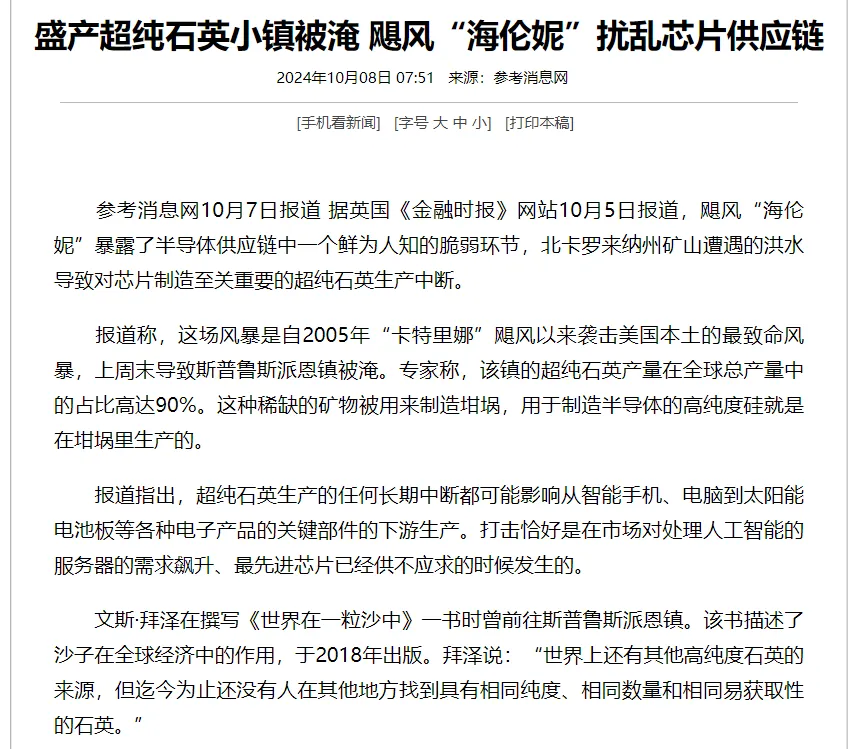 同時這場颶風還對全球產業鏈造成了微妙的影響,比如説海倫妮經過了北卡州的斯普魯斯派恩鎮,這個鎮子不大,但是全球半導體產業依賴的超高純度石英砂卻主要來自這裏;同時,海倫妮也導致了全美的輸液袋緊缺,生產全美大多數輸液袋的百特公司的主要工廠,也在北卡的一個城市,也在颶風的路徑上。