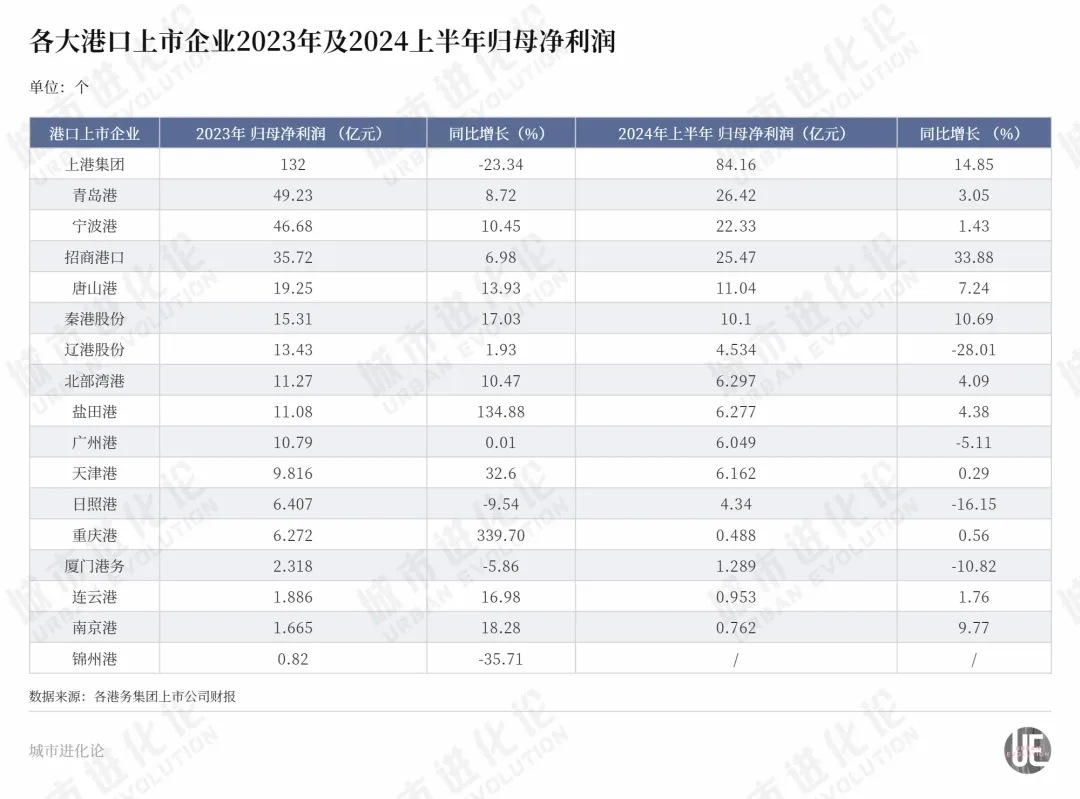 2023年中國港航船企業績報告顯示,寧波港的歸母淨利潤(46.68億元)僅約為上港集團(132億元)的1/3,也略低於青島港(49.23億元)。