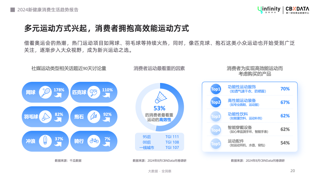 2024年作為體育大年,多項國際賽事在夏季展開,體育賽事的火熱、體育熱搜的霸榜、體育明星的帶動,都使得更加包容的體育文化被大眾所接受。運動不再侷限於一種類型或者一個場所,而是更加多元有趣,兼具健身、社交、娛樂等多重屬性;公眾對體育運動的認知也更加全面科學,高效能運動成為都市人羣首選。