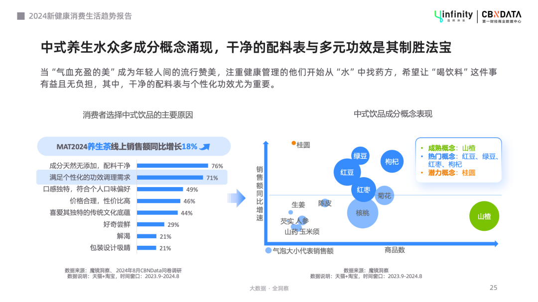 以MAT2024年線上銷售同比增長18%的“中式養生水”為例,紅豆、綠豆、枸杞、紅棗,這些傳統中式食材成為熱門概念。而超過七成的受訪者表示,乾淨天然的配料表和滿足個性化需求的多元功效是此類產品的重要賣點。