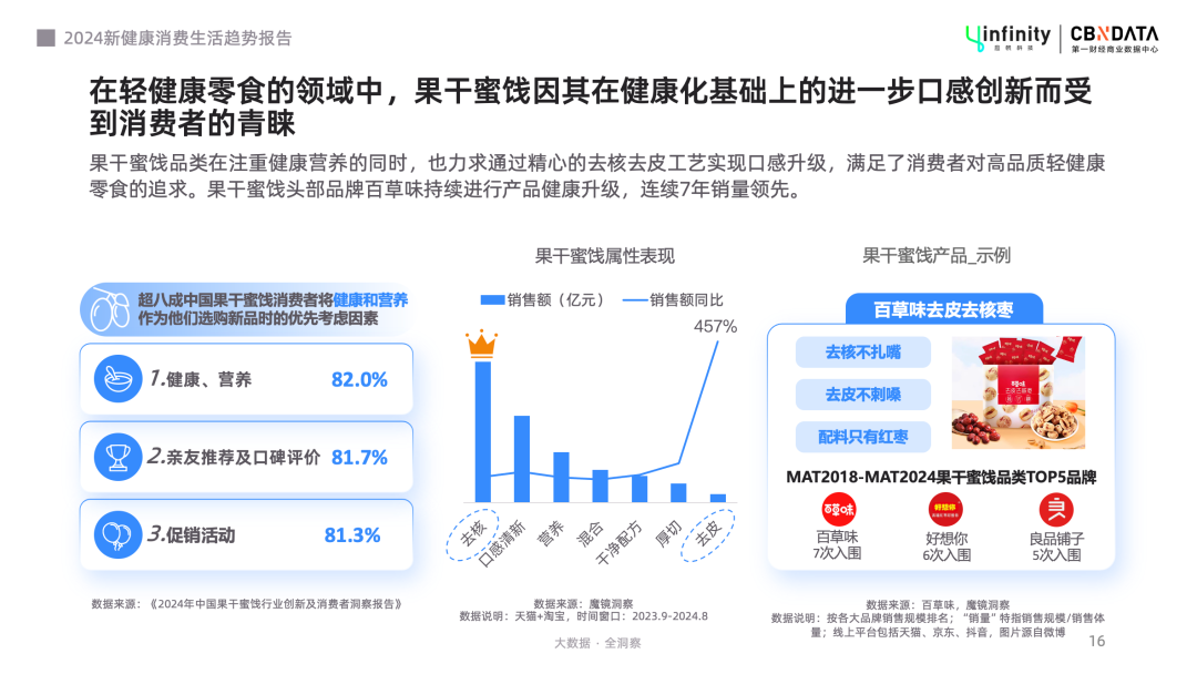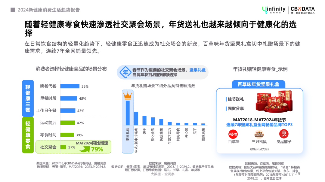 日常三餐之外,一些零食消費場景也成為商家尋求增量的機會點。CBNData發現近一年來,堅果禮盒品類超越其他各類零食成為送禮首選,這也是送健康的具象化體現。從品類銷售表現來看,百草味年貨堅果禮盒切中禮贈場景下的健康需求,連續7年全網銷量領先。