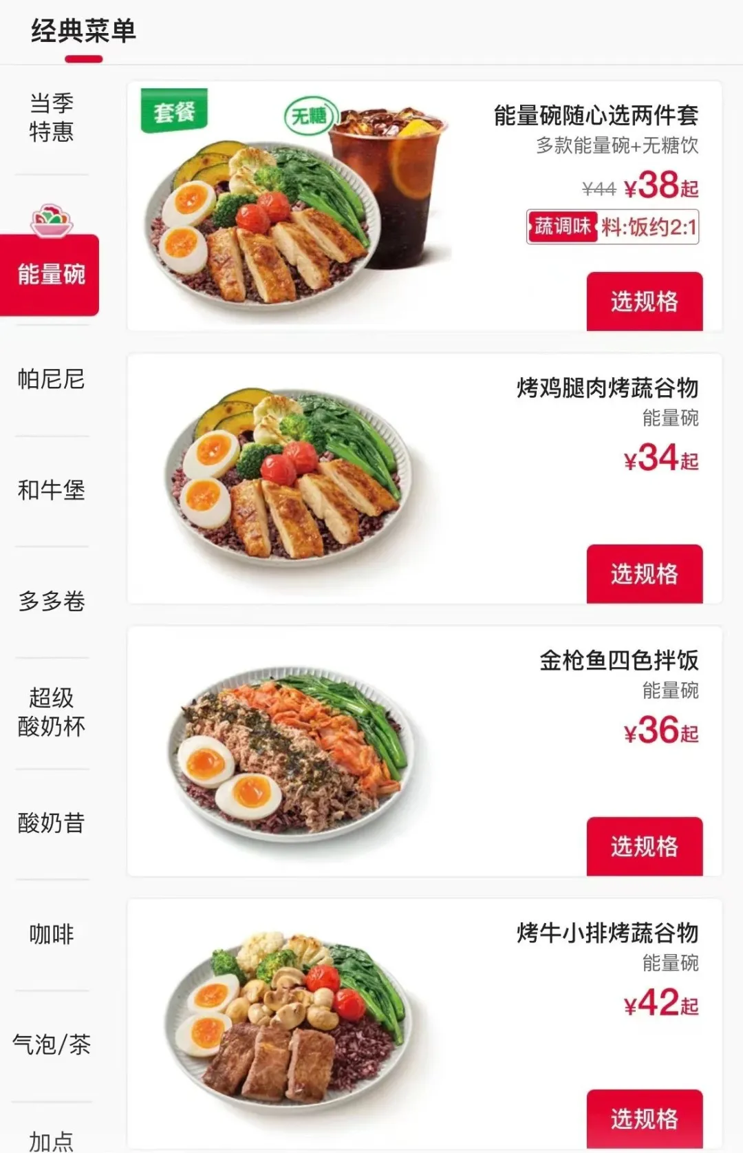 與肯德基經典的紅白Logo配色不同,KPRO餐廳一眼望上去就是健康的綠色,而且設計風格整體更加時尚年輕,更符合都市年輕消費者的審美。至於菜品更是主打一個健康,能量碗、帕尼尼、多多卷、和牛堡等都是注重蛋白質、蔬菜和水果合理搭配的產品,而飲品更是會着重強調低糖或者無糖,像酸奶昔、氣泡咖啡、0糖飲料等都多角度滿足了消費者對於健康美味的追求。