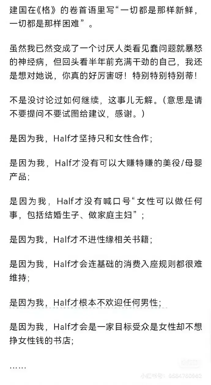 “從開店那天,我就預測了會是閉店的結局,但在我看來,這不是失敗,僅僅是一次體驗結束了而已。”在一次媒體採訪中,HalfBookstore店主Zoe曾這樣説過,“開過一家女權書店,留下一連串沒有答案的疑問,that’s it.”