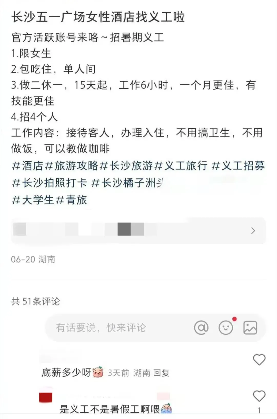 但不久後,這個“女性專屬避風港”卻以另一種方式被人熟知。6月20日,這家全女酒店發佈了一則“女性義工”的招聘,要求做2休1,15天起,每天工作六小時,店內提供食宿,僅招女性。招聘啓事中卻並沒有任何字眼提及薪酬的字眼,有網友在評論區詢問這項工作的底薪時,被回覆道: