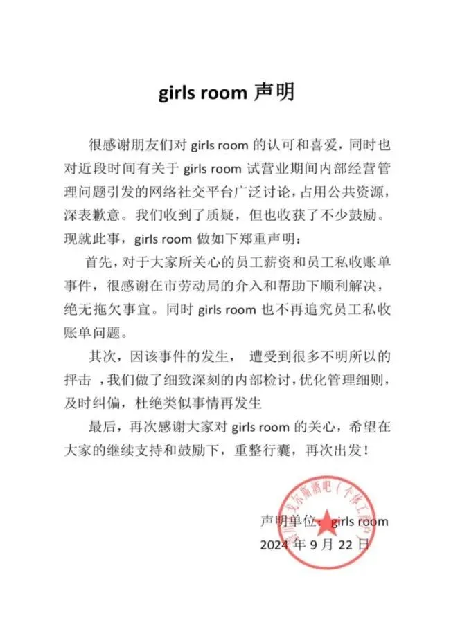 南通市全女酒吧girls room在糾紛和爭議發生後,於社交平台發佈聲明。