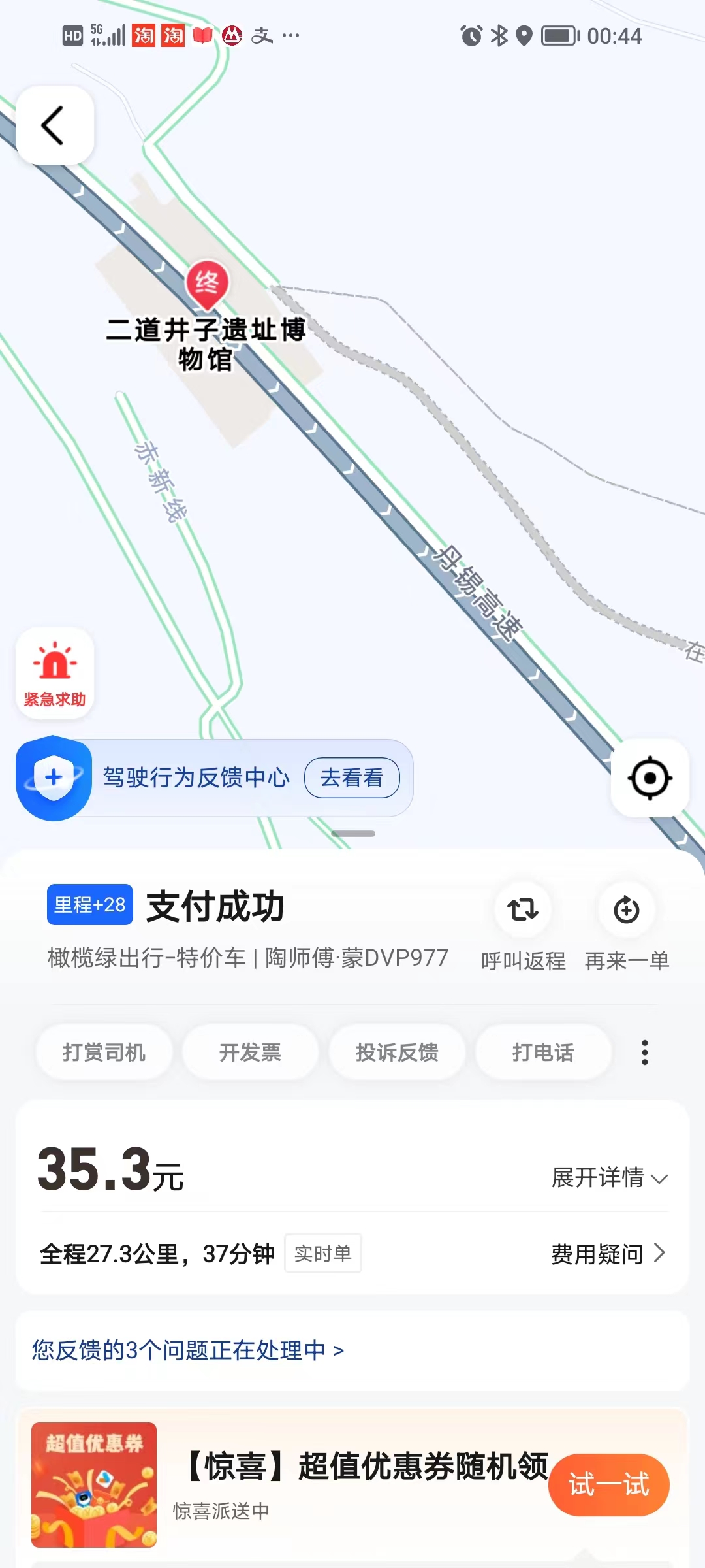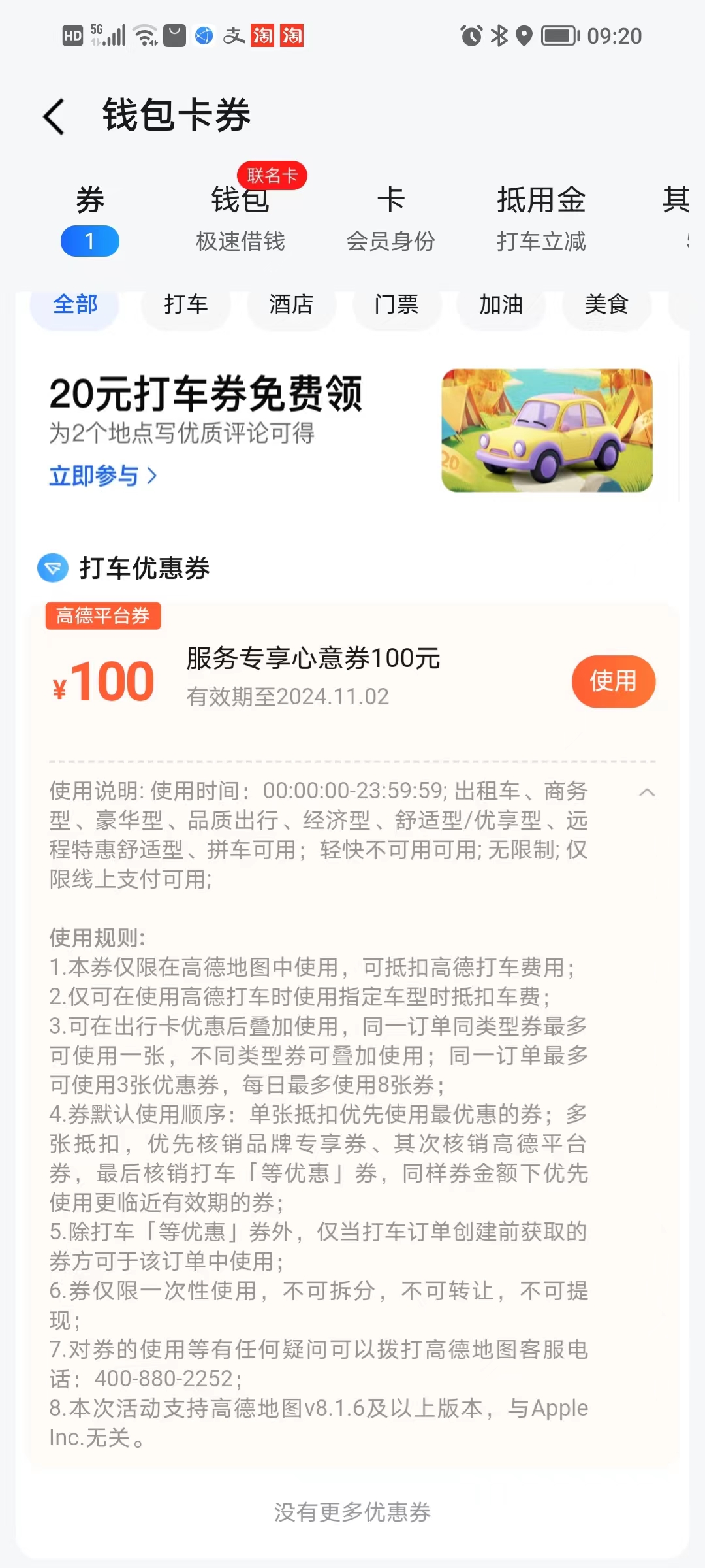 後面就是我聯繫高德客服,解釋訂單的情況,提交各種證據,等待高德專員給電話給處理方案。電話裏高德專員也非常強勢,除了這個訂單退款,説最多補償一百元,然後就掛了。後來我看了所謂的補償,就是一張百元打車券,只能用一次,期限是一個月。這個補償就是糊弄人啊,我在電話反饋鏈接裏提交了不滿意補償方案,希望專員再次來電話溝通。等了幾天也沒電話來,我就再次主動打電話給高德客户,接電話的對事情似乎完全不瞭解,讓我二十四小時內等電話。高德專員再次來電話,我提出要求一百元分成小額券能疊加,使用期限要延長,對方堅持一百元券沒法改,拒絕了我的要求,然後掛了電話,這樣強勢的客服還真是少見。一百元券真不是錢的問題,高德系統的錯誤,還理直氣壯用一張券打發人!