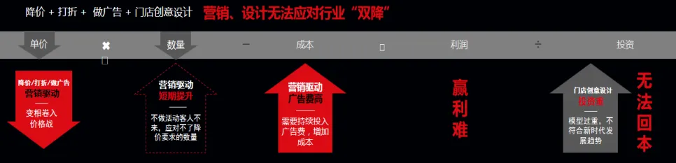當前的現狀是單價及數量都出現了雙降,大多數餐飲企業試圖通過營銷、打折來提升數量,結果打折動作實施後發現不但沒能帶來預期的數量,反而提升了廣告費,最糟糕的是這種現象相當於自殺,直接導致贏利模型破裂,面臨關店窘境。