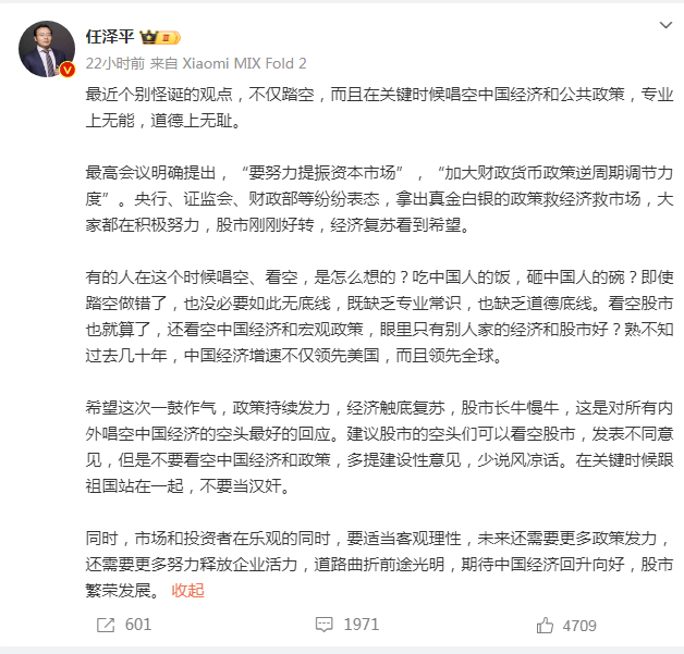 我對任澤平先生本身沒有意見,我過去經常轉他的文章,主要是文章中的數據值得參考。但對他“開盤即收盤”、鼓吹大牛市有不同看法,特別是在“存款大搬家到股市的背景下”……過去任澤平先生也高喊過“拿着黨章入股市”……我覺得作為經濟學家最好還是更“理性客觀”些,不能衝動!