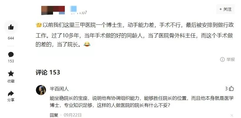“事實上,做醫生和去行政後勤的職業發展道路是不同的,老實告訴你,它們一個是處於業務核心,其實就是打工的,一個處於權力核心,也是醫院的核心。我們這裏是三甲醫院,跟我同一批進來的兩個同事,其中一個博士生動手能力差,手術非常不行,最後被打發到行政做黨建工作,另一個博士當年手術做得極好,專耕臨牀,這都十多年了,手術好的那個如今成了醫院骨科主任,而這個手術做的差的,已經升了院長。”