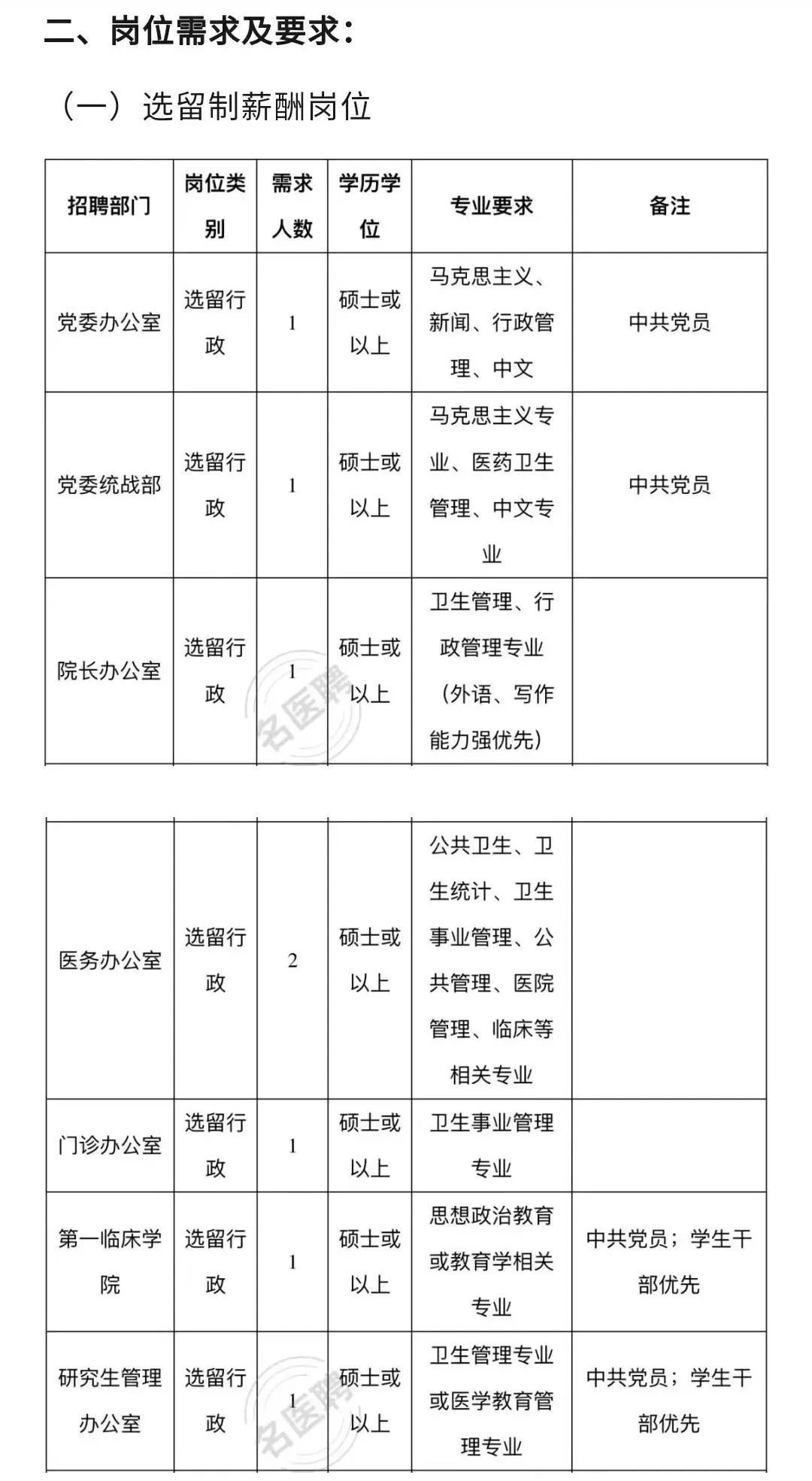 例如,2023年華中科技大學同濟醫學院附屬協和醫院招聘行政與後勤崗位時,僅醫務辦公室、病案統計科和雜誌社招收臨牀醫學應屆生。該院人事處招聘,要求管理類專業、人力資源管理方向優先;門診辦公室招聘,要求衞生事業管理專業優先。在學歷方面,想要進行政後勤,最低都得是個碩士,還得是中共黨員。