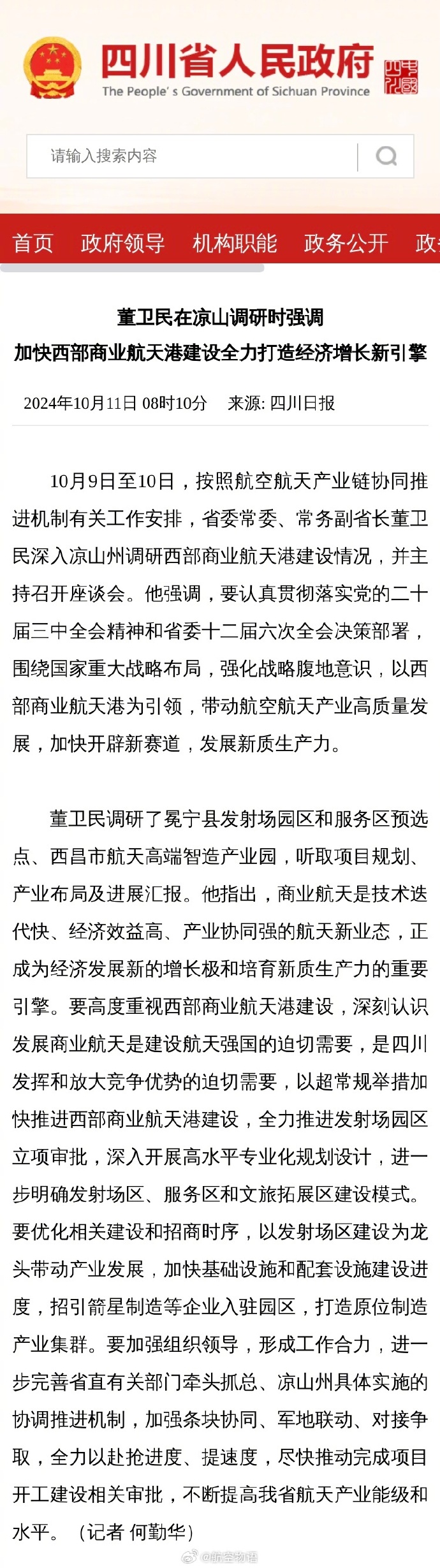 據四川省政府官網,副省長董衞民在涼山調研時強調,加快西部商業航天港建設全力打造經濟增長新引擎。西昌衞星發射中心就位於涼山州。這篇報道可以看出,至少四川省政府有計劃、有決心,大力在涼山打造包括髮射在內的商業航天全產業體系。