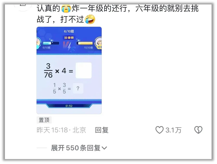 但是,官方還有個數據説,軟件裏除了簡單算術,其實也有別的PK題庫,比如六年級以上的: