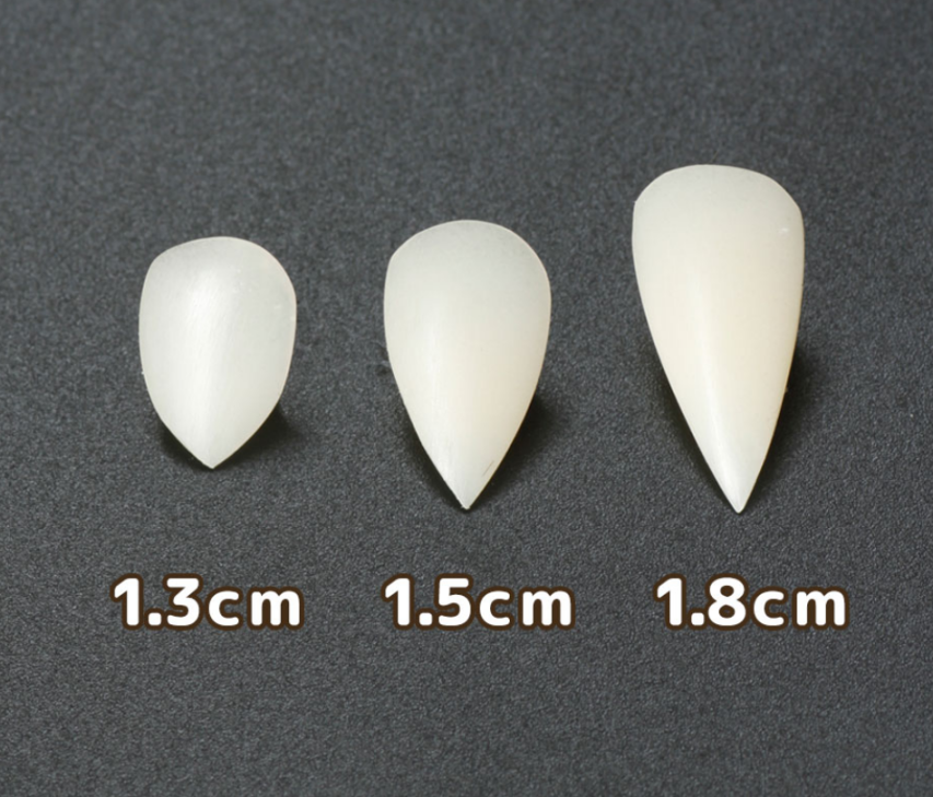那時候市面上不存在專門的產品,只有萬聖節cos吸血鬼用的獠牙,使用樹脂製作,需要用短效膠水粘合在自己的牙齒上,不具備撕咬咀嚼功能,一吃東西就必須取下來。而且這玩意是模擬幻想生物,尺寸普遍偏長,形狀也過於尖鋭,哪怕選擇最短的版本,戴上去也略顯猙獰。
