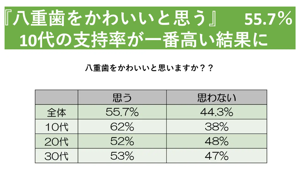 今年9月份日媒做了一次問卷調查,看看有多少人覺得八重齒可愛,結果55.7%的受訪者都認為八重齒很可愛,在10到20歲的年輕人中喜愛度更是達到62%,完全可以説是主流審美了。