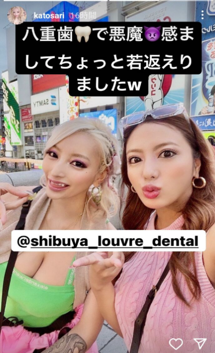 做完之後,也確實會有一堆人誇你的好看,讓你的虛榮心得到極大滿足。像日本的女演員加藤沙裏,2022年的時候就去做了一對假八重齒,還發文回顧了自己的整牙歷程——“12歲時因為牙不齊做了正畸,32歲時又把一口整齊的牙弄歪,感覺自己變年輕了一些。”