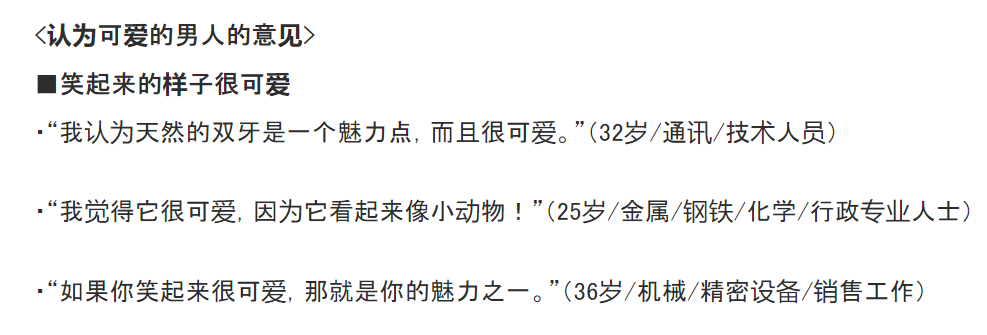 雖然説可愛是種感覺,很難説清楚具體的原因,但日本人還是努力組織語言,描述了一下心中的想法。比較常見的觀點是,八重齒露出兩顆虎牙,**讓女生看起來像貓咪之類的小動物,給人一種想要呵護的衝動;而且很多人認為八重齒是孃胎裏帶出來的,是個人特徵,有種天然的美,不需要刻意改變;還有些人覺得,八重齒帶着青春萌動的感覺,**顯年輕。