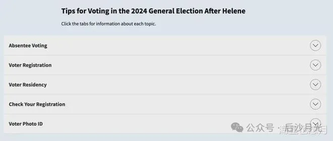 北卡州政府官方迅速推出了專題頁面,幫災民查詢與選舉有關的幫助信息。而對災民安置、電力恢復、山區道路搶修等問題則不聞不問。