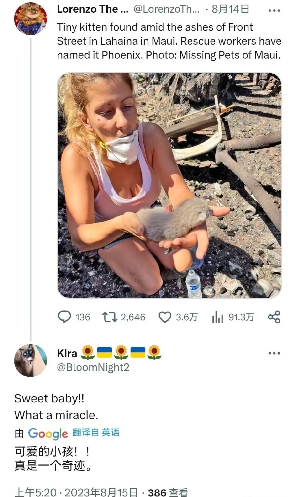 救援人員宣稱從毛伊島拉海納鎮前街的灰燼中救出了一隻小貓,並命名為“鳳凰”(不死鳥)。