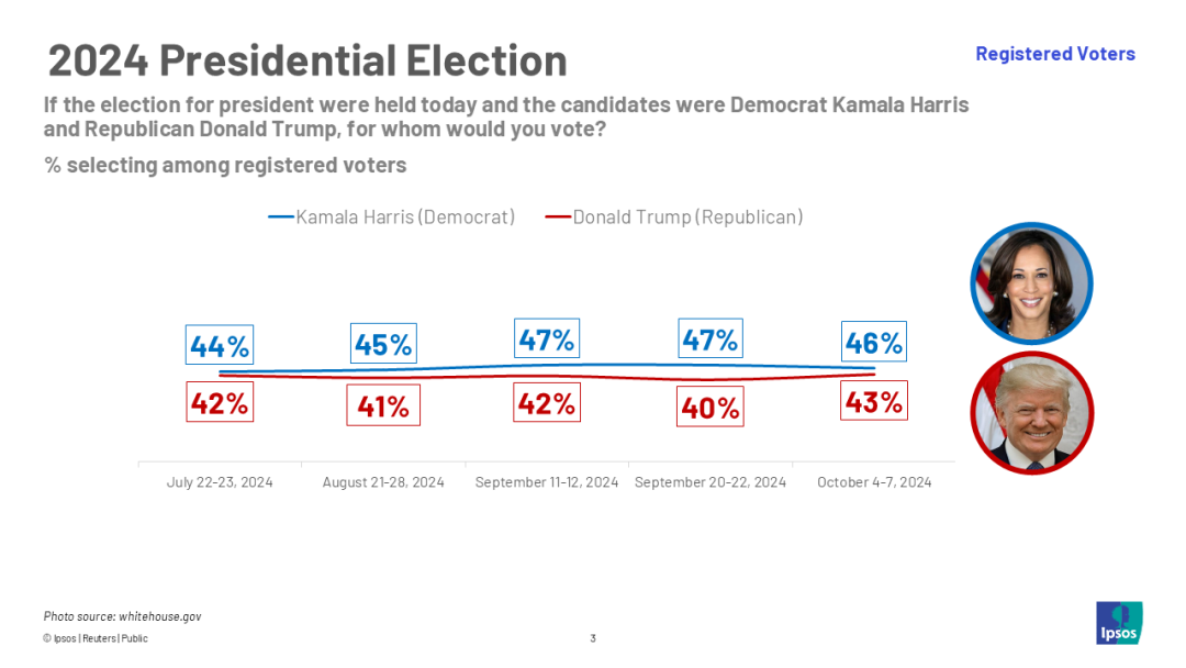 ▲根據路透社和益普索10月7日公佈的民調,哈里斯以46%的支持率領先特朗普的43%。圖源益普索網站