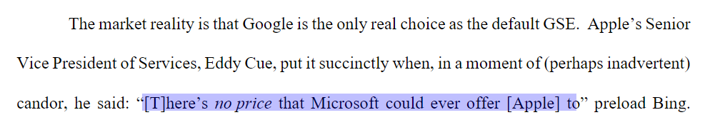 這筆錢的效果顯著,法官説谷歌的搜索引擎市場份額從 2009 年的約 80%,飛漲到這兩年的 90% ,隔壁必應的份額還不到 6% 。