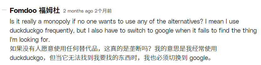 言下之意,就是我用谷歌不光是為了錢,也是為了給用户更好的體驗。谷歌會壟斷,還不是因為 Bing 這些傢伙太拉了。