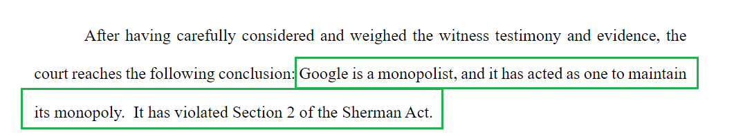 谷歌是一家壟斷企業,並且它一直以壟斷者的身份行事,其壟斷行為違反了《 謝爾曼法案 》第二條款。