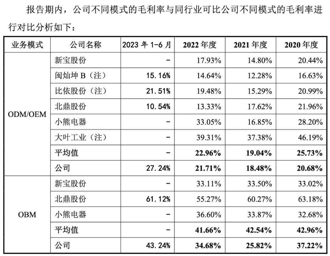 在衝刺A股的審核問詢函回覆中,香江電器曾披露過他們與同行可比公司OEM/ODM以及OBM的毛利率。