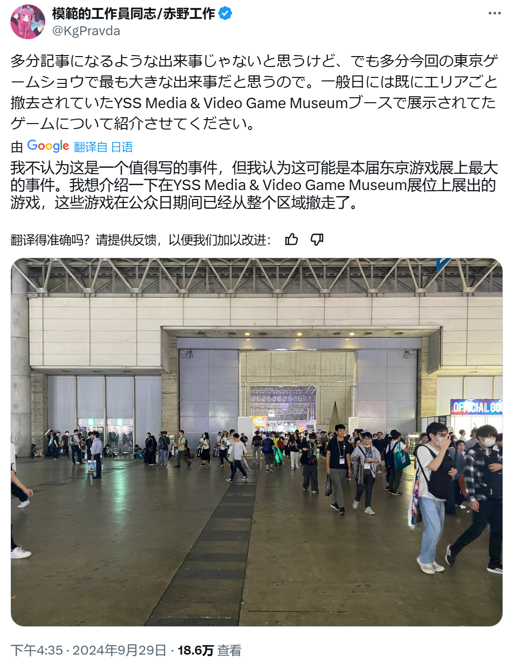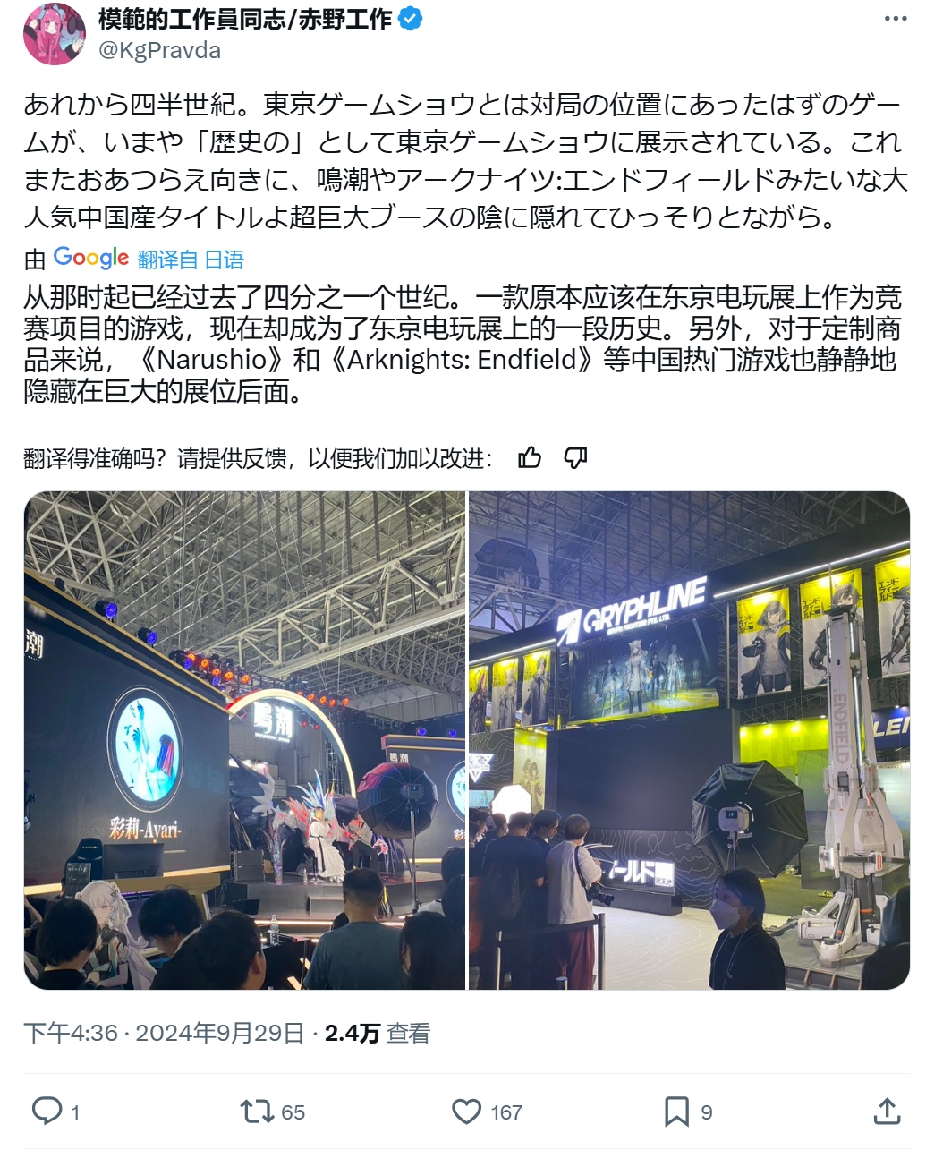TGS始於1996年,在當時,恐怕無論是中國還是日本,都不會有任何玩家預測到外星科技的遊戲有朝一日會在東京以古董的形式展出。經過30年的歲月,在2024年的今天,在《林則徐禁煙》的旁邊就是《明日方舟:終末地》的巨大展台,聚集了大量年輕的日本玩家。