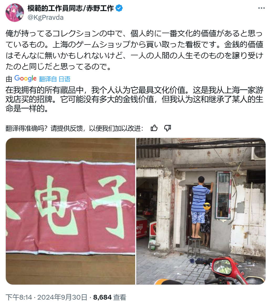 就在參觀完TGS之後,赤野工作還在推特上分享了他當年從上海買回來的一件藏品——一家遊戲店因動遷而即將關門時,卸下來的招牌橫幅。