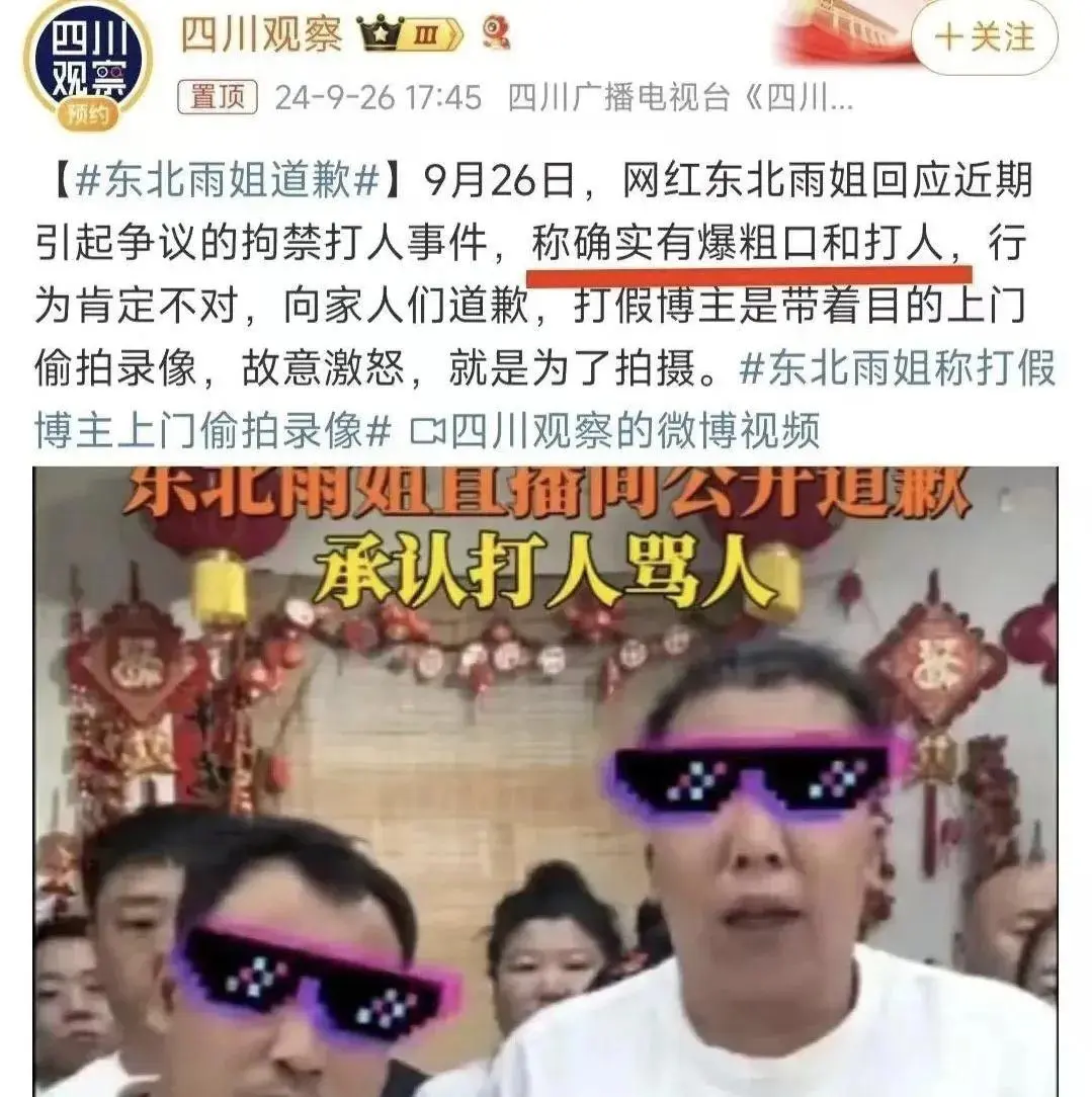 又比如,有一位打假博主帶着紅薯粉到東北雨姐家中想討説法,雙方發生衝突,“善良樸實”的東北雨姐帶頭摧毀其錄像設備,在社會上引發惡劣影響。