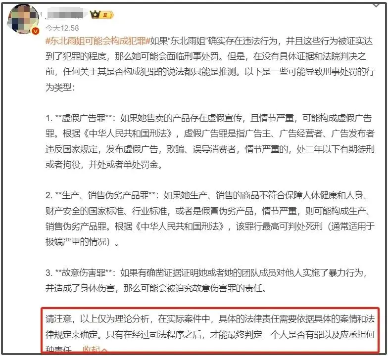 官方首輪迴應之後,就有律師分析表示,一旦東北雨姐構成犯罪,就要面臨最低二年以下、最高十五年有期徒刑或無期徒刑。相關法條明確規定,不光生產商要承擔責任,銷售商也要承擔。
