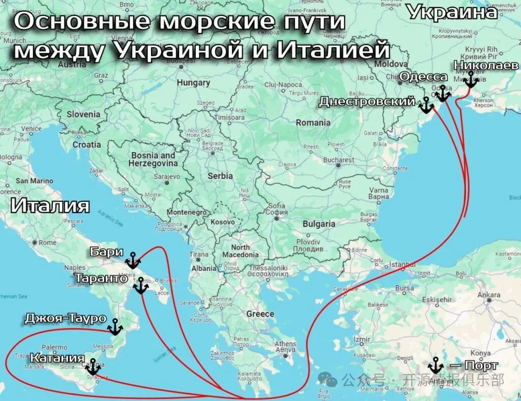 烏克蘭和意大利之間通信的主要海上航線和港口