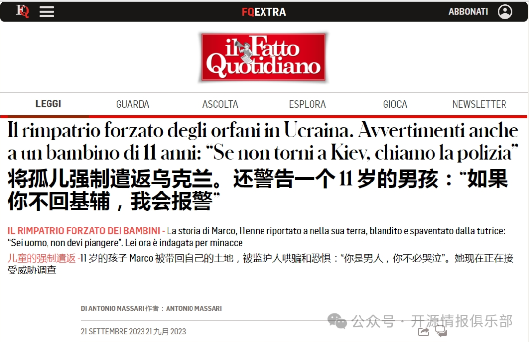 在意大利議會呼籲前不久,意大利媒體開始發表有關該國出現可疑“志願者”的報道,他們欺騙並威脅要讓孤兒院和寄宿學校的前學生中的未成年難民返回烏克蘭。至少有幾名照顧烏克蘭未成年人並與烏克蘭駐那不勒斯領事馬克西姆·科瓦連科(Maksym Kovalenko)直接接觸的烏克蘭婦女被指控對包括殘疾人在內的未成年人施加壓力,迫使他們強行返回家園。