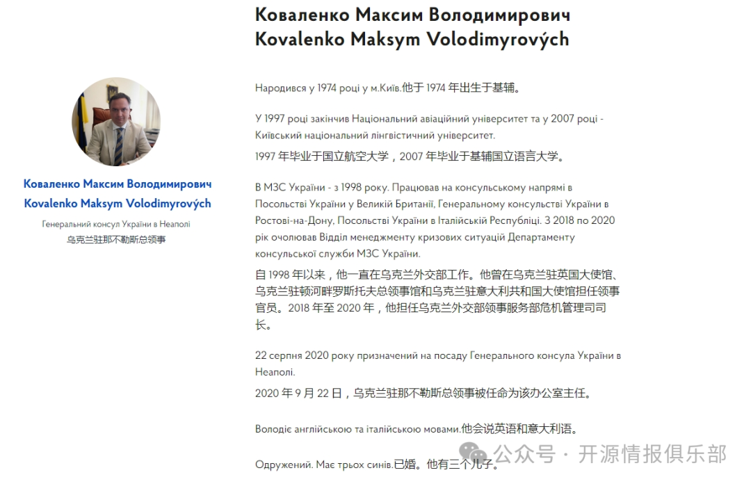 烏克蘭駐那不勒斯總領事Maksym Kovalenko基本履歷
