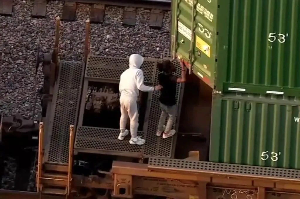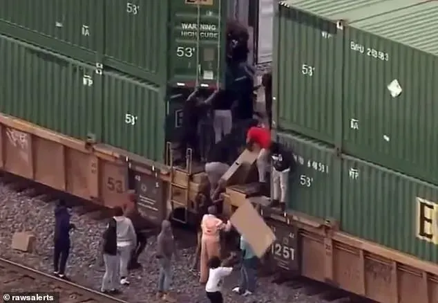 據目擊者稱,這羣劫匪不是“單打獨鬥”,而是通過快速而協同的行動,在短時間內搬空了一個集裝箱。現場拍攝的視頻顯示,有人可以清晰地看到幾名男子爬上列車,將貨物箱子從敞開的集裝箱中搬出,然後再遞給等待在旁邊鐵軌上的其他同夥。