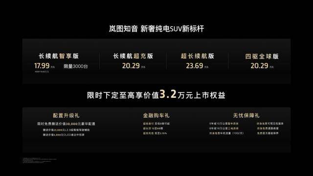 按照限時下定的專屬政策,購車最高可享價值3.2萬元的上市權益。最終,嵐圖知音落地價約為17.99萬元起,大大降低了購車門檻,性價比優勢進一步凸顯。