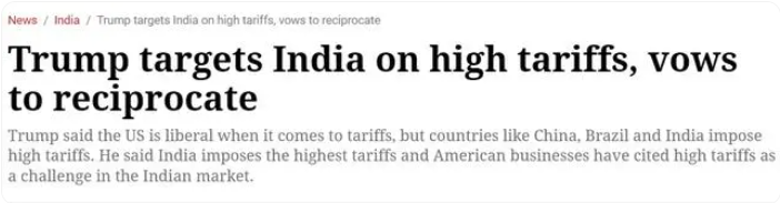 這不是特朗普近期第一次釋放類似的信號。就在上個月莫迪訪問美國的時候,特朗普就放話稱,印度“嚴重濫用”了與美國的貿易關係。再把時間往前推,他在去年指責印度對美國商品徵收的關税太高,表示重返白宮後美方會對等地提升關税。