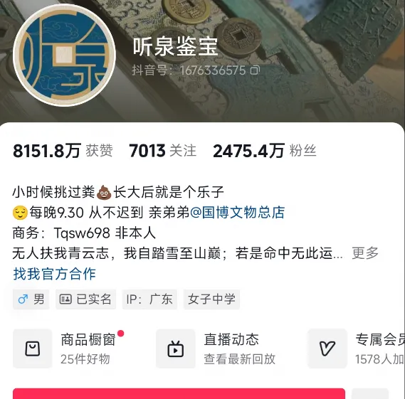 由於搞笑的人設,高強度和網友互動,有時候還有福利和短劇看,這讓聽泉鑑寶獲得了大量的流量,就和咱們開頭提到的一樣,半年內就漲了1500粉絲,真的非常牛了。