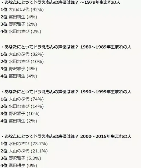 之前有日本媒體曾根據年齡段調查“你心目中最認可的哆啦A夢的聲優是誰?”2000年之前出生的人們幾乎壓倒性選擇了大山羨代。2000年後出生的孩子們選擇的則是水田山葵的版本。