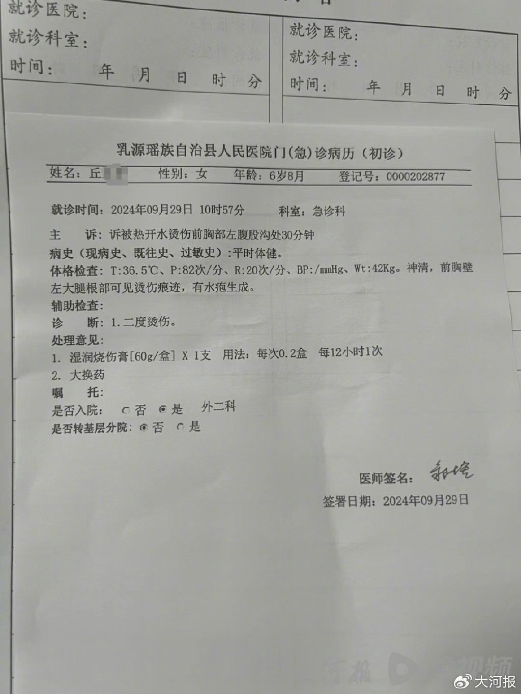 據悉,乳城派出所對女童燙傷事件屬於意外還是故意傷害正在調查中。