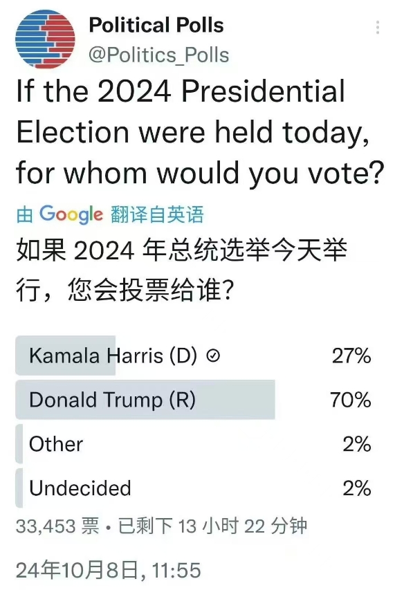 之前特朗普一直威脅扎克伯格,聲稱其參與了上次美國大選的舞弊,要求將其關入大牢。如今媒體大佬臉書CEO扎克伯格表示這次自己選擇中立,而收購了推特改名為“X”的馬斯克公開站台特朗普,可見他們都有自己的渠道去獲知真實的信息。加上筆者之前看到抖音等平台也是特朗普支持者遠勝於哈里斯支持者來看,美國這次選舉,特朗普大概率要勝。