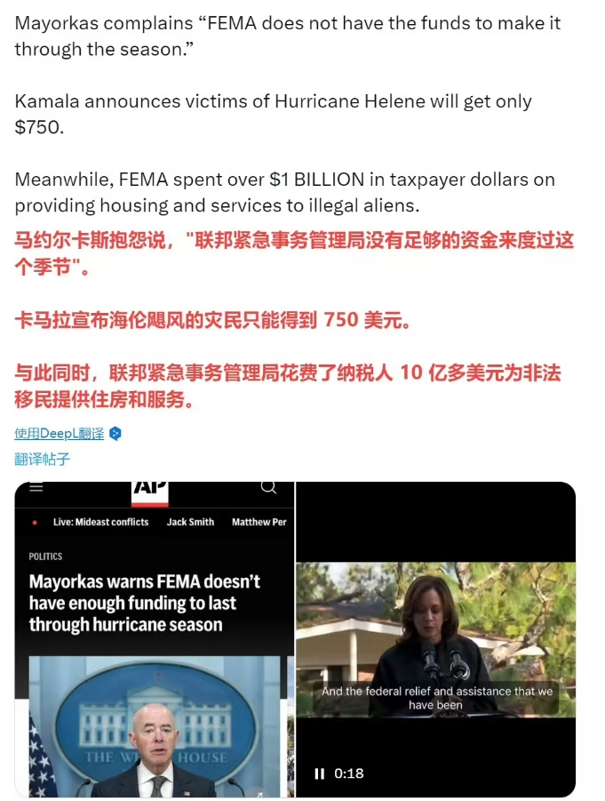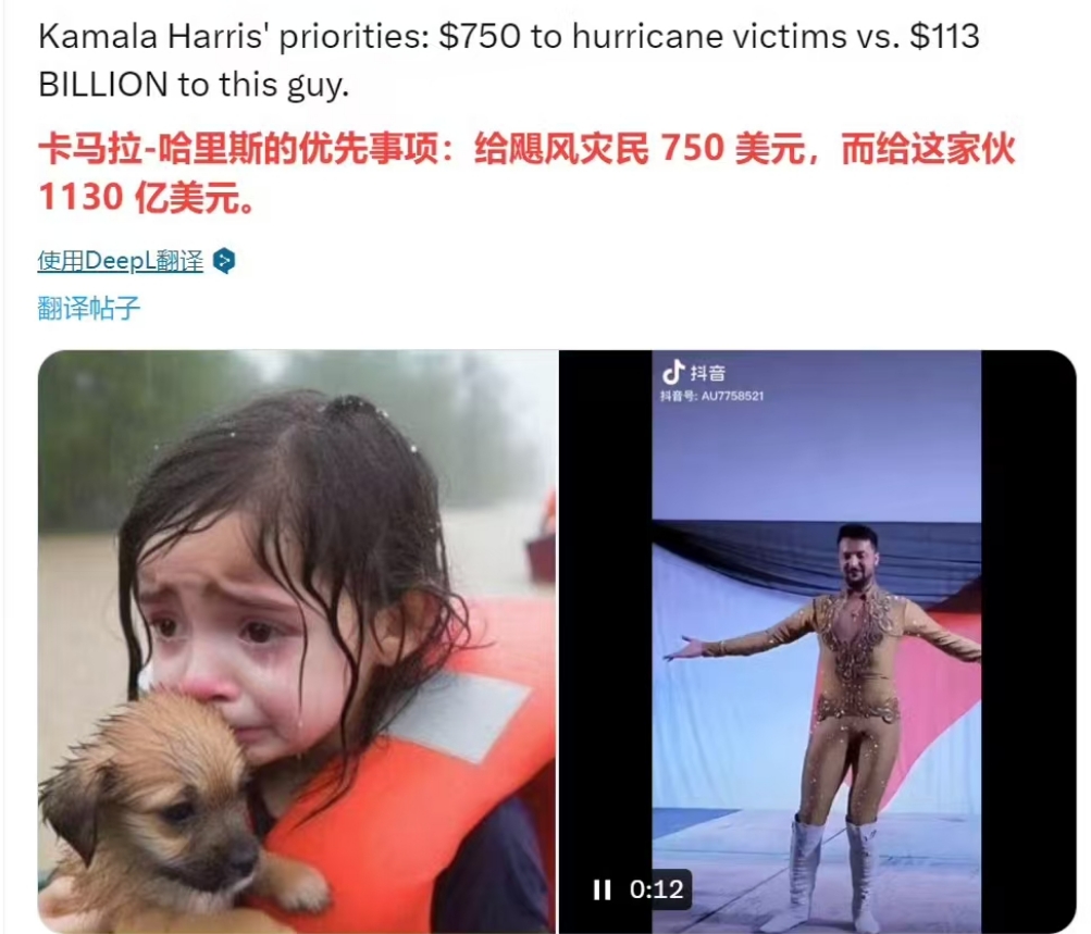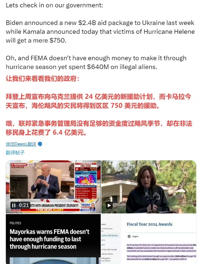 在推特上充斥着這樣的橋段:美國副總統兼民主黨總統候選人哈里斯出人意料的慷慨,她宣佈向颶風海倫妮的受害者發放750美元的一次性補助,為了救災,佛羅里達州應改為烏克蘭州。美國政府本次應付颶風災害很不利肯定與黨派之爭有關,由於這次颶風襲擊的是主要是共和黨及特朗普支持者。